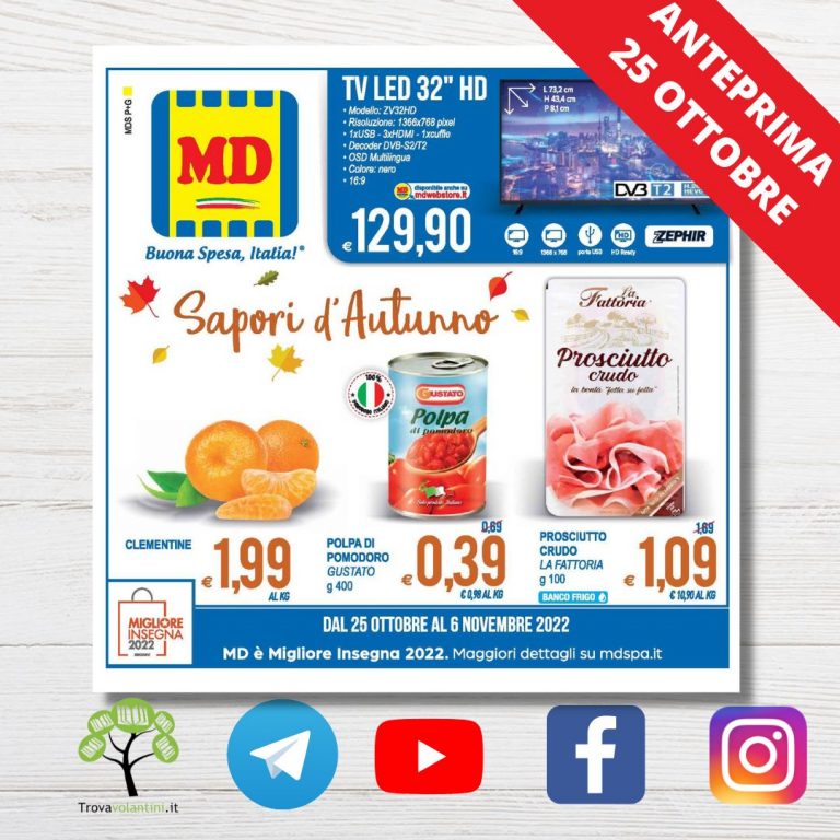 Sfogliamo insieme (in anteprima) il nuovo #volantino #MD dal 25 ottobre al 6 novembre TV LED 32″ a 129 euro!!!!Se ti è piaciuto questo volantino condividilo con i tuoi amici#TROVAVOLANTINI